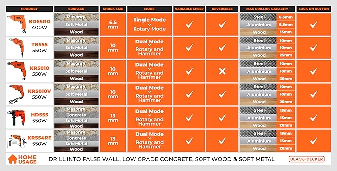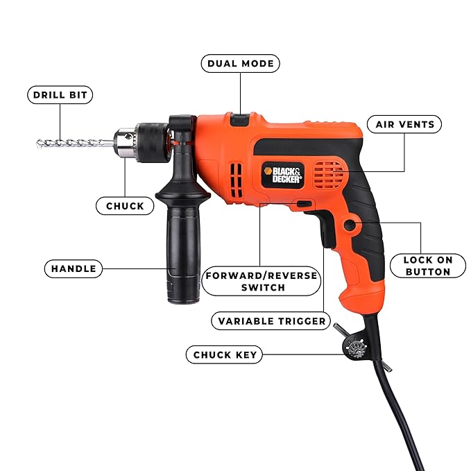 BLACK+DECKER KR554RE 550W 13mm Corded Variable Speed Reversible Hammer Drill Machine with Lock-On & 4 Drill Bits, For Home & DIY Use for Masonry, Steel & Wood, 1 Year Warranty, ORANGE & BLACK